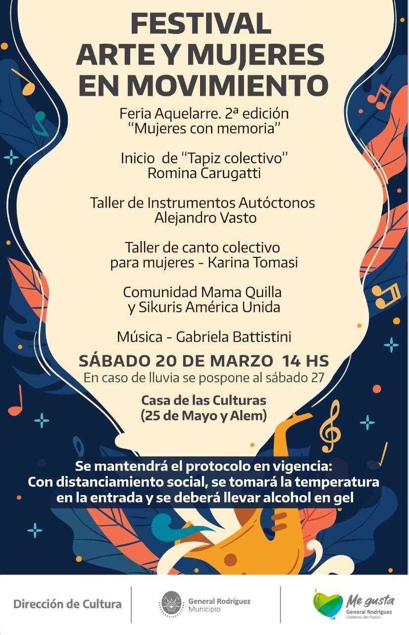 Este sábado 20 de marzo, la Dirección de Cultura de General Rodríguez llevará adelante el Festival “Arte y Mujeres en Movimiento”, una jornada con talleres artísticos y exposiciones en homenaje a todas las mujeres.