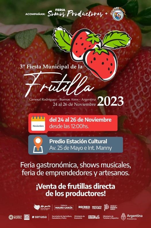 Luego del éxito de los dos festivales pasados se vuelve a realizar en nuestro distrito la Fiesta de la Frutilla, evento promocionado por el gobierno de la Provincia de Buenos Aires que reúne a cientos de productores locales, donde se exhibirán sus productos y las mejores frutillas del país.