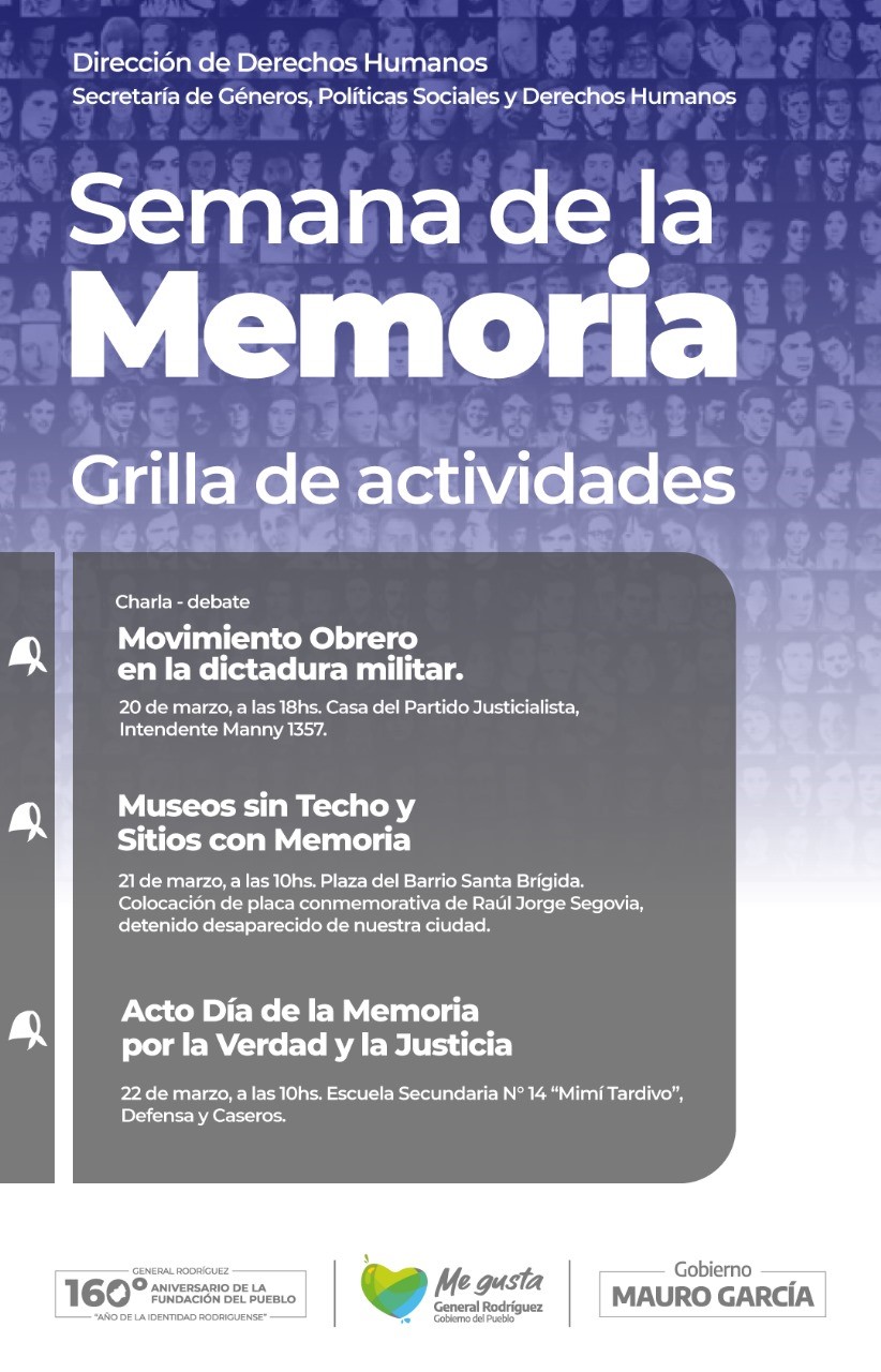 El miércoles 20 de marzo se realizará una muraleada en la Sede del Partido Justicialista de General Rodríguez, ubicado sobre la calle Intendente Manny al 1357, además de una Charla- Debate sobre el Movimiento obrero en la Dictadura Militar, a partir de las 18 horas.