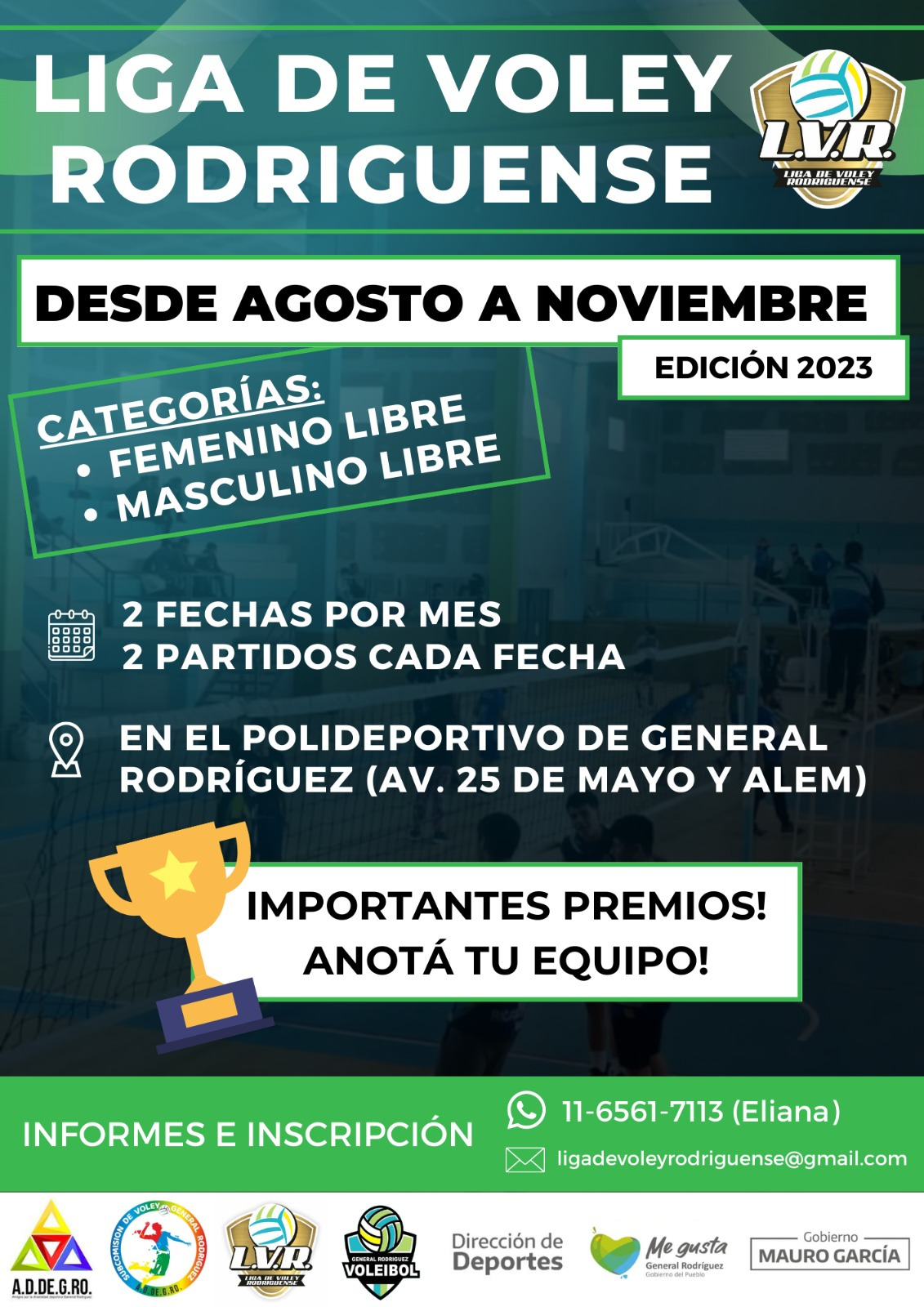 Para inscribirse y solicitar más información, deberán comunicarse al 1165617113 (Eliana) o escribir al siguiente correo electrónico ligadevoleyrodriguense@gmail.com