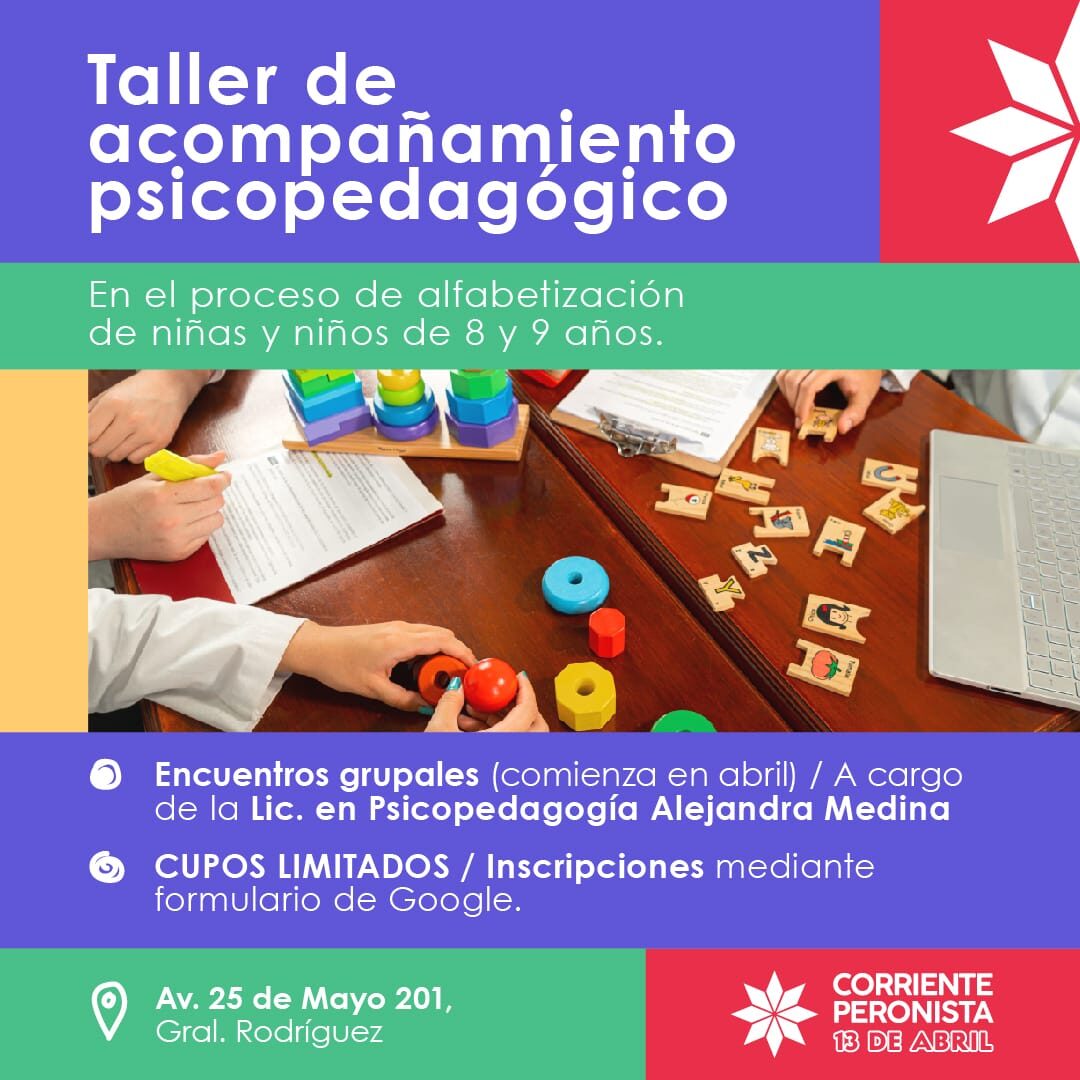 Durante este mes de abril comenzara el Taller de Acompañamiento Pedagógico que se llevara a cabo en la sede de la Corriente Peronista 13 de Abril, cita en Av. 25 de Mayo 201. El mismo esta destinado para niños y niñas de entre 8 y 9 años para consolidar su proceso de alfabetización. El mismo es totalmente gratuito y se encuentra abierto a toda la comunidad, pero los cupos son limitados.