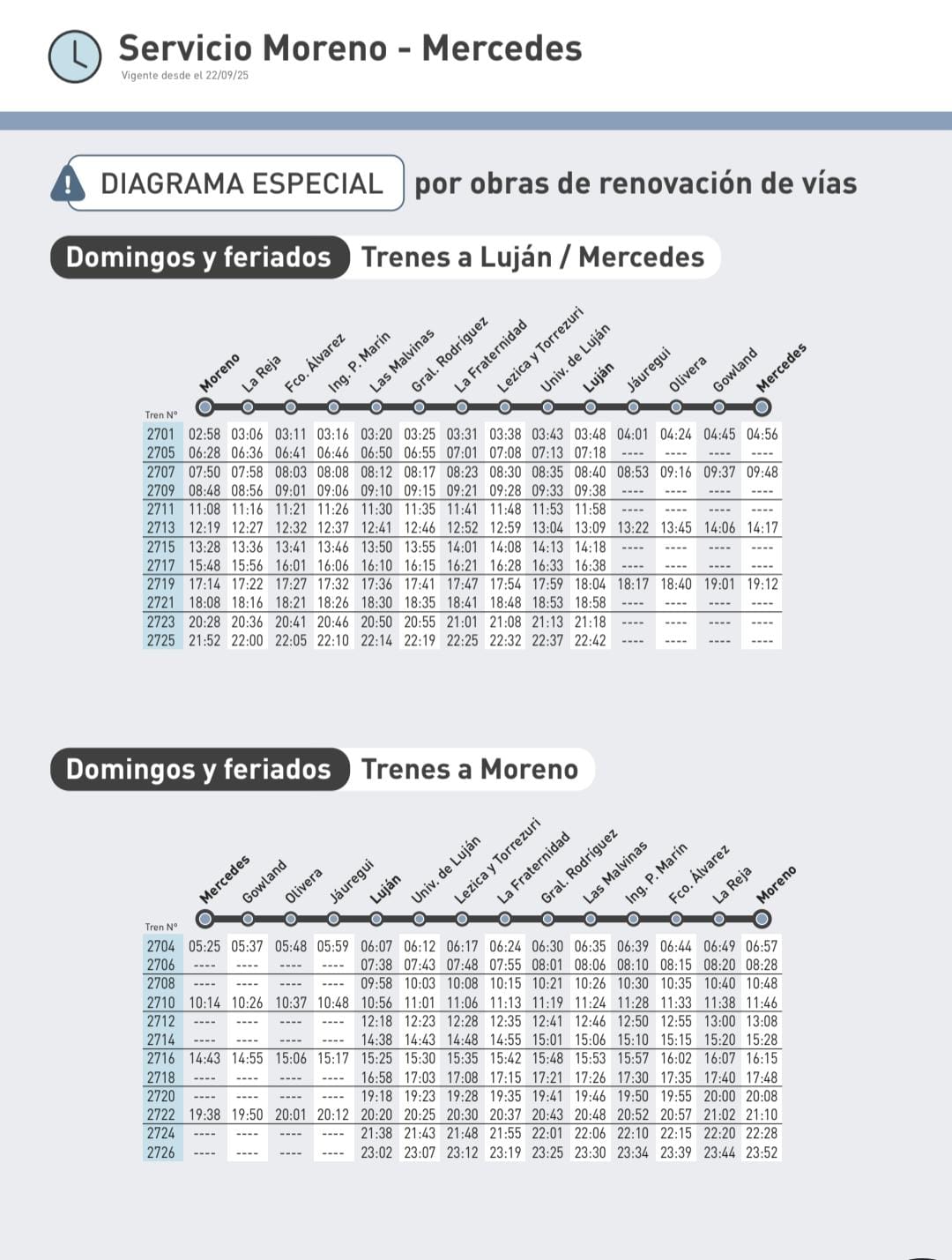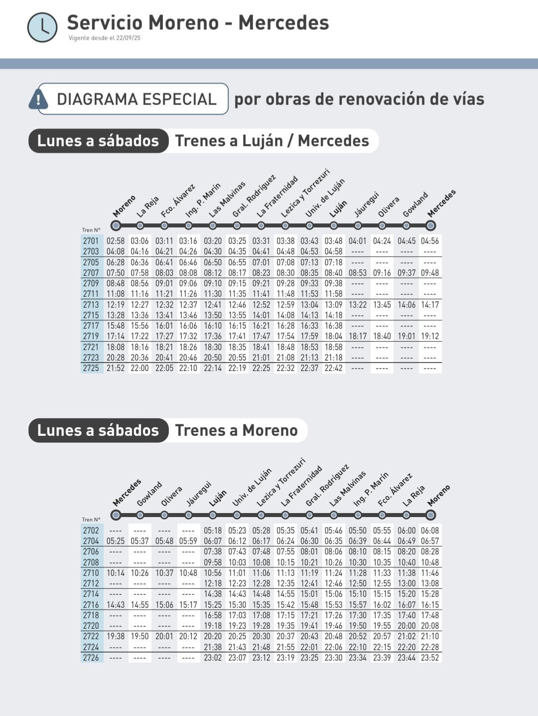 En las estaciones de Luján, Jáuregui, Olivera y Gowland, siguen los trabajos de Trenes Argentinos a menor escala, es por eso, que siguen reducido a 4 formaciones por día los trenes con llegada a la ciudad de Mercedes.