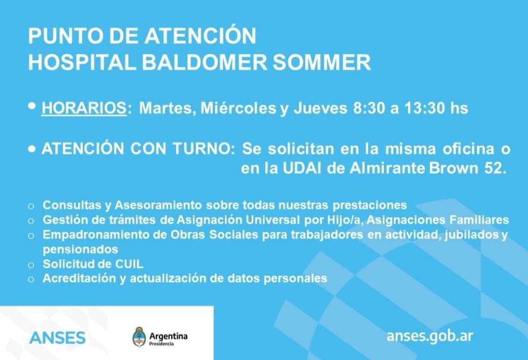 Las oficinas del nuevo punto de atención de ANSES que se encuentra en el ingreso al Hospital Nacional Baldomero Sommer, funciona todos los martes, miércoles y jueves de 8 a 13.30 horas.